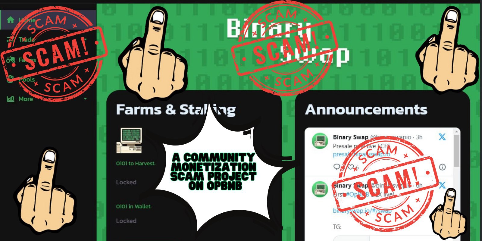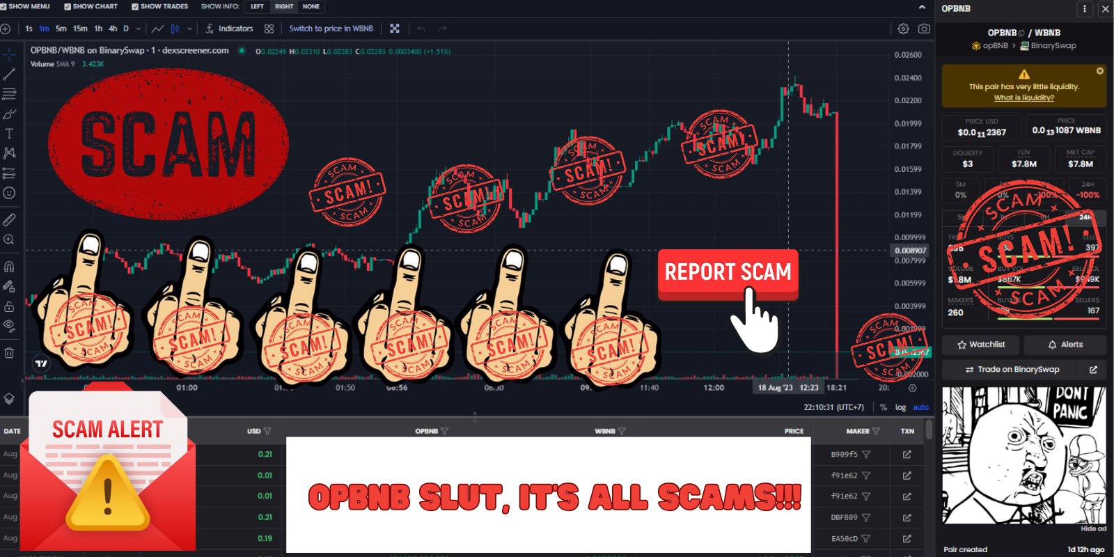 OPBNB is a reputable network in the cryptocurrency world, but it has been exploited by some malicious actors to create fraudulent projects like "0101", "opbnb", and "opankeswap". These projects often lack real products or services and rely heavily on large advertising campaigns to deceive investors. To counter this issue, we created the project "FUCK OPBNB" with the goal of exposing these scammers and providing an opportunity for those who have lost money to recover their losses.